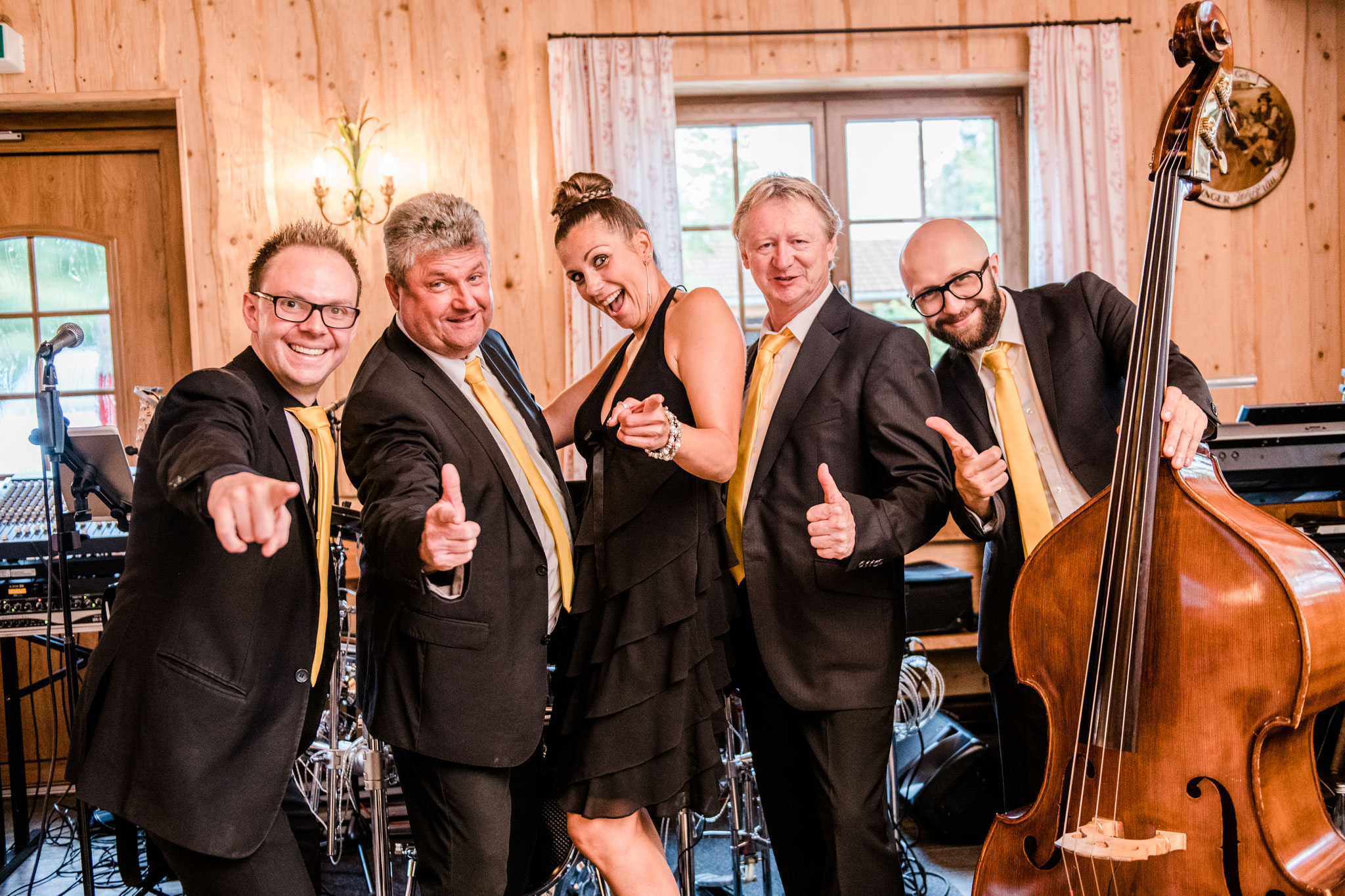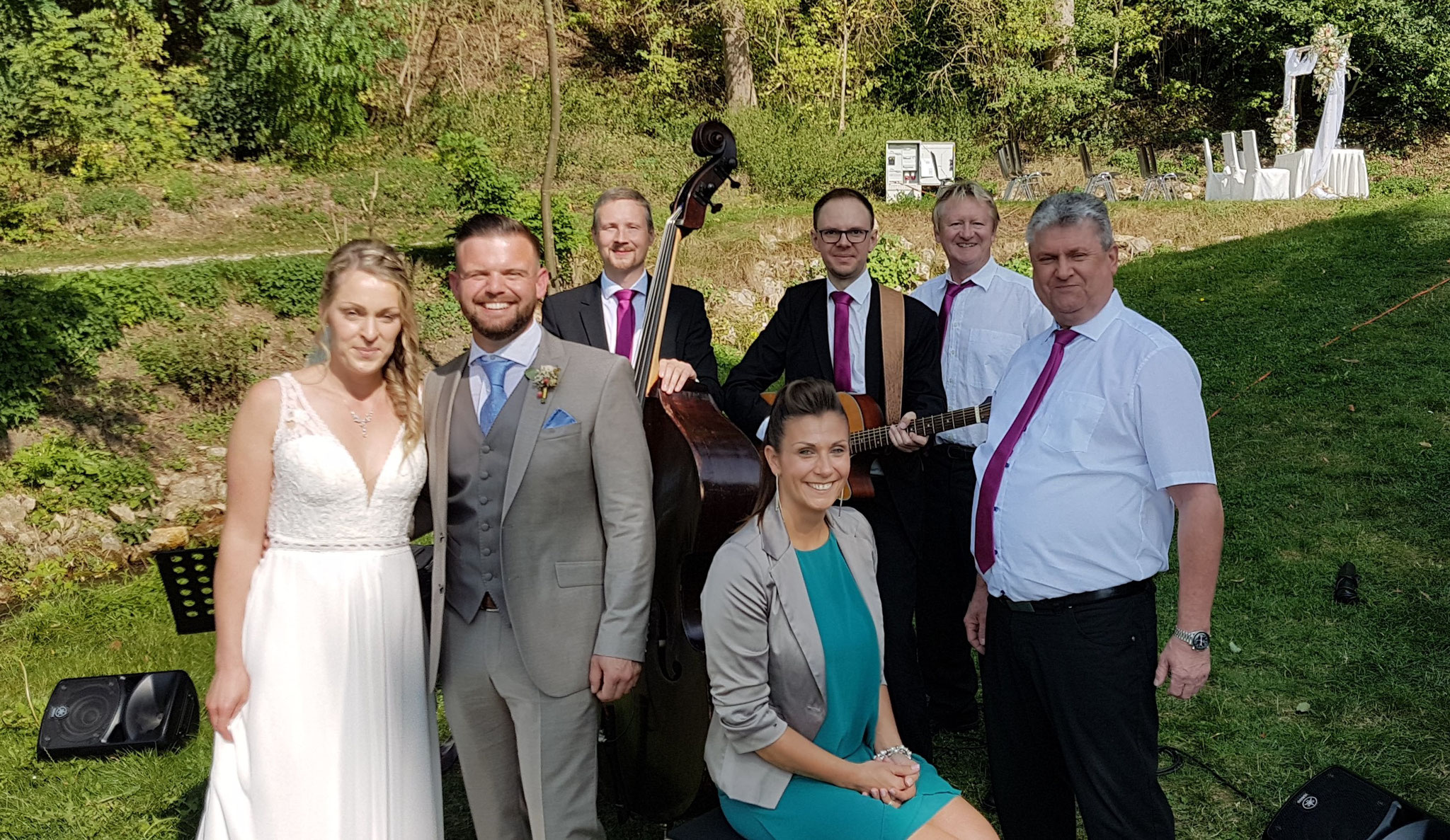 auch wir möchten es nicht verpassen, Euch ein Dankeschön hier zu hinterlassen!!! Ihr habt unsere Hochzeit zu jeder Minute mit der passenden Musik umrahmt und damit immer die richtige Stimmung gezaubert - das war einfach absolut spitze!!! Schon die ruhige Untermalung unseres Sektempfangs hat bei unseren Gästen fürs erste Lob gesorgt. Und diese gute Musikauswahl hat sich durch den ganzen Tag gezogen. Dass der Brautverzug alle mit einbezieht und uns als Brautpaar nicht blamiert hat uns besonders gut gefallen. Aber dass ihr uns dabei mit Eurer Musik so einheizt und diese Stimmung bis zum Schluss aufrecht erhalten konntet hat uns wie auch die Gäste wirklich restlos begeistert!!! Wir hatten Euch zuvor auf einer Hochzeit erlebt und wussten sofort, dass Ihr die richtige Band für uns seid. Unsere entsprechend hohen Erwartungen wurden mehr als erfüllt und so hatten wir einen gigantisch schönen Tag und werden wir Euch in jedem Fall weiterempfehlen. Macht weiter so! :-)