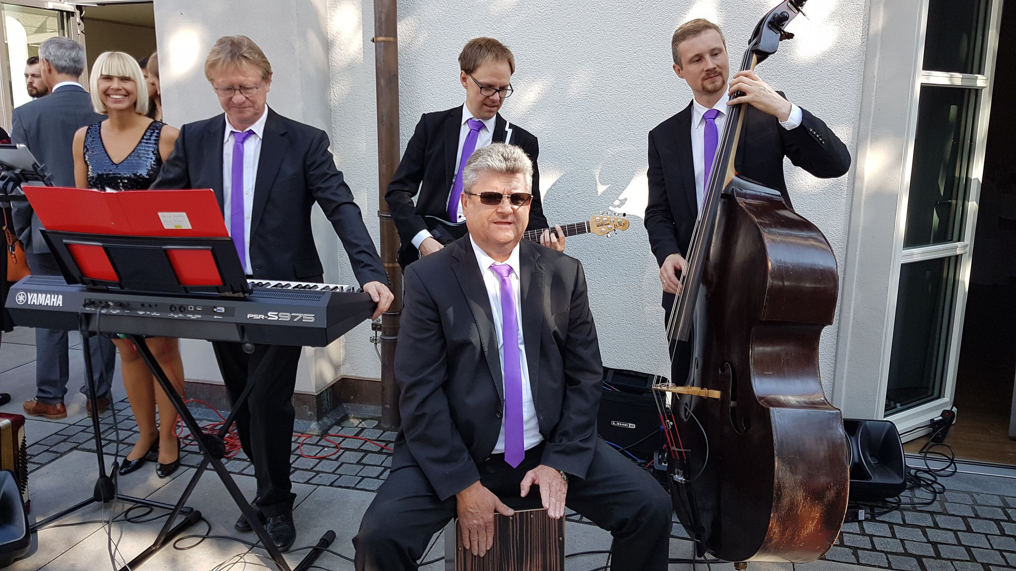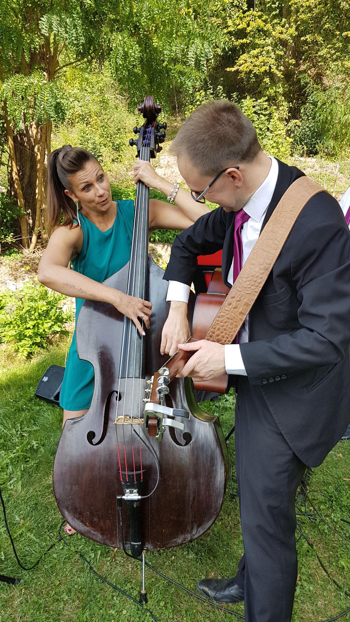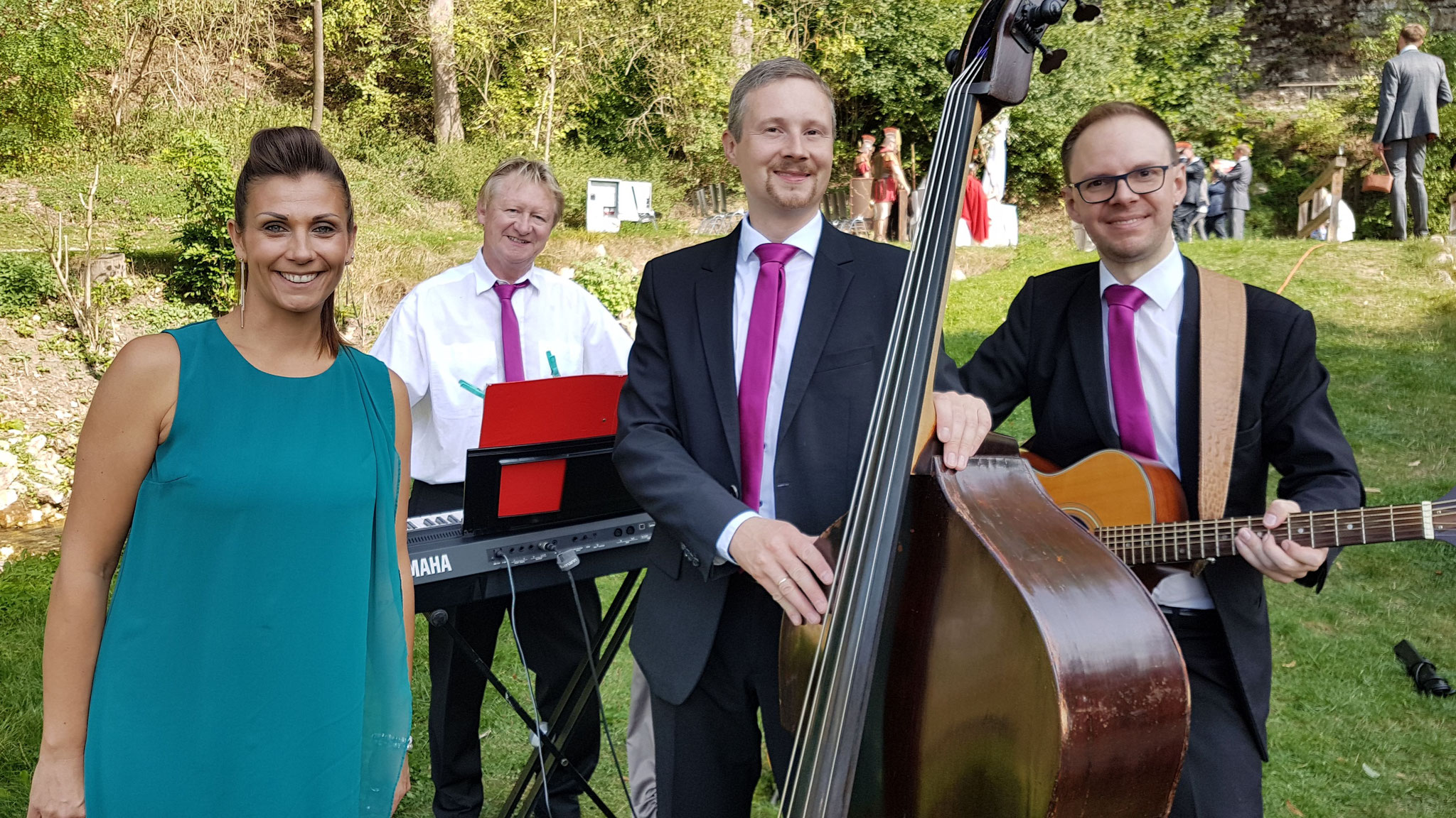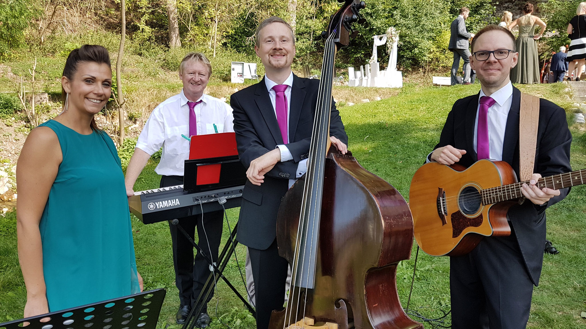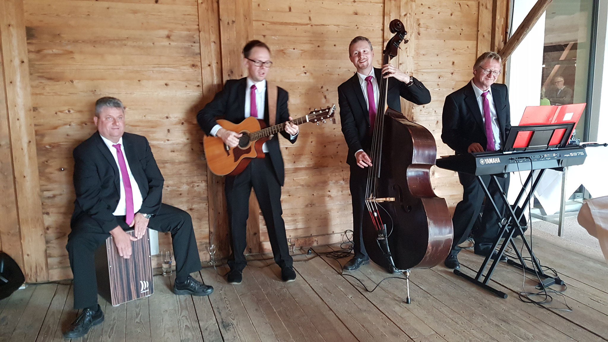 Optional untermalen wir als Hochzeitsband Euren Sektempfang / Gästeempfang in der Region Neufahrn mit Gitarre, E-Piano, Contrabass, Cajon und auf Wunsch auch mit Sängerin.